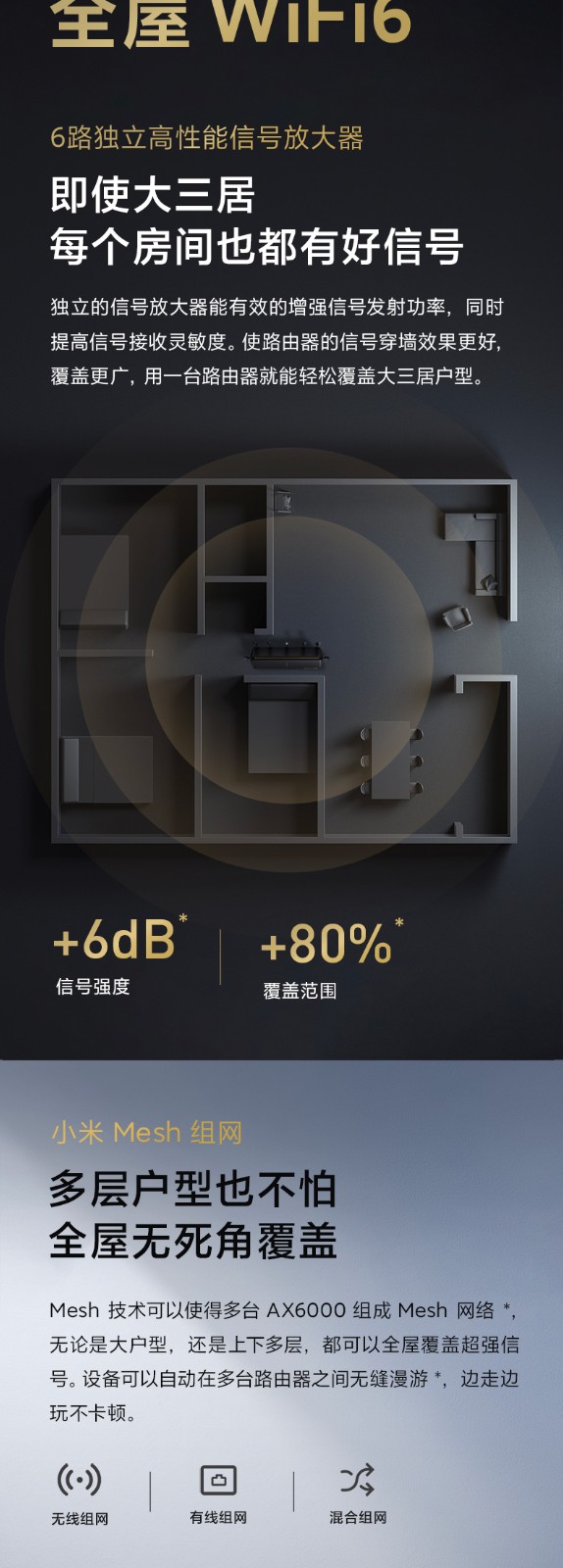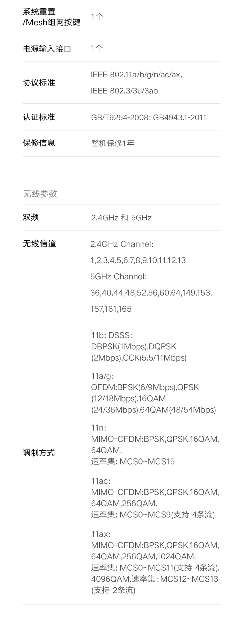 規(guī)格參數(shù) 其他屬性 售后服務 全國聯(lián)保 網絡標準 802.11b 802.11g 802.11a 802.11n 802.3u 802.3 802.11ac wifi6 有線傳輸率 千兆端口 無線傳輸速率 6000Mbps 無線網絡支持頻率 2.4G&5G 適用對象 大戶型 專業(yè)游戲路由 基本參數(shù) 顏色分類 小米路由器AX6000 配置參數(shù) 是否無線 是 無線傳輸速度 5400M 是否內置防火墻 是 是否支持WDS 是 是否支持WPS 是 是否可拆 不可拆